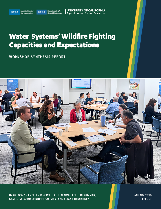 As urban wildfires grow larger and faster-moving, the public and policymakers are asking new questions about what water systems can realistically do to fight the spread of extreme fire events. This report synthesizes findings from the first workshop hosted by UCLA and the UC Agriculture and Natural Resources’ Water Supply + Wildfire Research and Policy Coordination Network. The report examines water systems’ wildfire-fighting capacities, limitations, and resilience needs. Forty-two experts from water agencies, fire services, research institutions, and state and local organizations discussed and evaluated system risks, infrastructure constraints, communication and coordination challenges, and potential interventions. Participants emphasized broad agreement that water systems cannot reasonably be expected to stop large urban wildfires and that public expectations often exceed system design requirements, but also identified potentially replicable case studies. They also identified the need for clearer communication, stronger cross-agency coordination, and careful evaluation of trade-offs in infrastructure investments. The report highlights priority areas for future research, including cost-benefit assessments, statewide guidance options, and integrated planning approaches. These insights aim to support more informed preparedness, response, and recovery at the water–fire nexus.